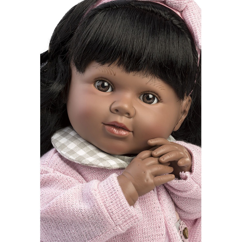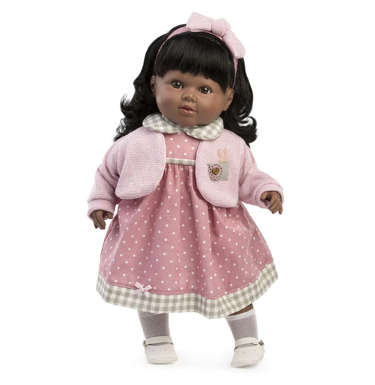 A Maria Alice é uma bonequinha encantadora, cheia de ternura e delicadeza. Com os seus olhinhos doces e expressivos, um sorriso meigo e um visual amoroso, conquista facilmente o coração de miúdos e graúdos. O seu lindo vestido rosa com bolinhas, combinado com o casaco suave e os detalhes delicados, dá-lhe um ar elegante e muito especial.